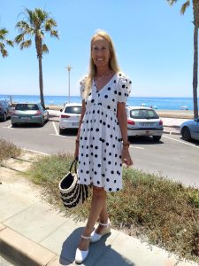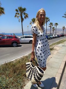 El vestido blanco con lunares negros, es de corte Naif con las mangas abullonadas y escote en pico. El tejido es vaporoso muy ligero para esta época de calor.